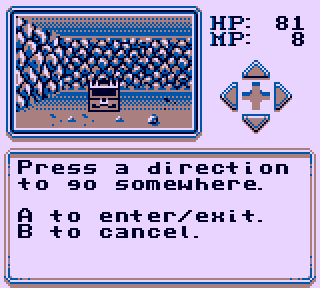 - Press A to enter a place (cave, town, building) and B to cancel moving around.